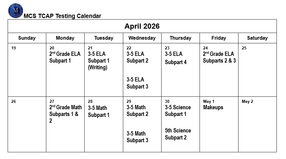 Good morning parents/guardians,We just wanted to remind you that TCAP (state testing) starts next week. Our students have been working really hard, and we're excited for them to show what they've l...